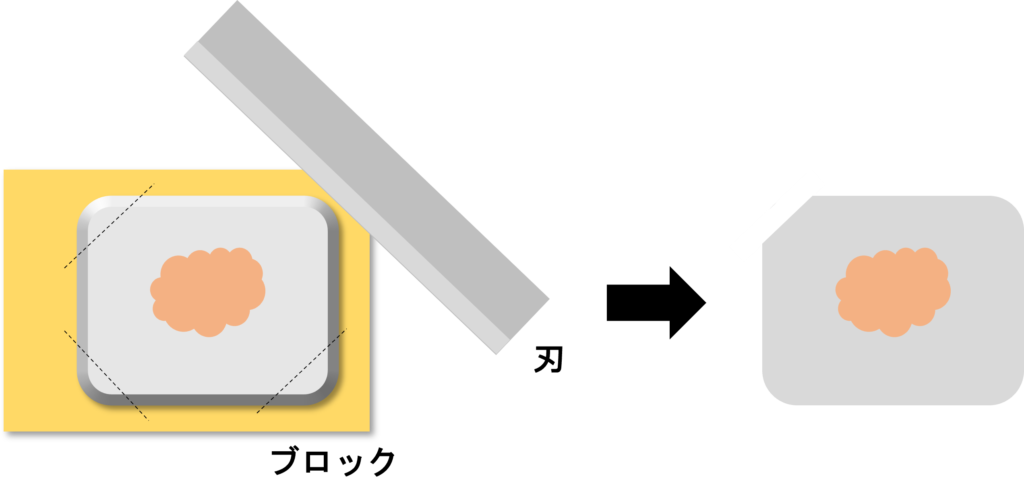イラストのようにブロックの右上から刃が入る場合、点線の3か所のいずれかを削る等しては薄切後に向きが分かるようにします。例えば、左上を削って薄切すると、右のような切片ができます。